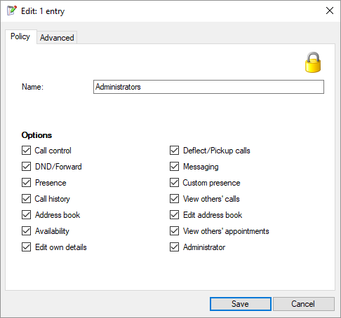 - Umleiten/Anrufe annehmen - Zeigt die Optionen Umleitung und Abnehmen im Präsenz-, Vorschau- und Telefon-Fenster. Ohne diese Option, wird der Benutzer Anrufe für andere Nebenstellen vom Präsenz-Fenster nicht abnehmen oder das direkte Umleiten eingehender Anrufe an andere Nebenstellen durchführen können.